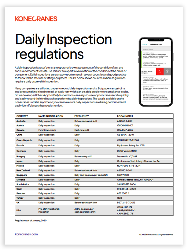 A daily inspection is a user’s (or crane operator’s) own assessment of the condition of a crane and its environment for safe use. It is not an expert’s examination of the condition of the crane or component. Daily inspections are statutory requirement in several countries and good practice to follow for the safe use of lifting equipment. The list below shows countries where regulations require a daily or pre-shift inspection.