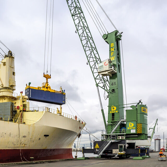 Der Modell 5 Kran bedient Containerschiff bi zur 17. Reihe, also bis zur Post-Panamax-Klasse. Die hohe Traglast bis zu 125 t bei 18 m Ausladung ermöglicht das Laden und Löschen besonders schwerer Projektlasten.