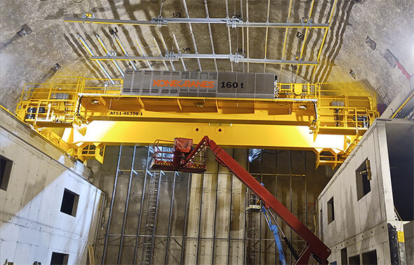 Für das neue ÖBB Pumpspeicherkraftwerk Tauernmoos wurden drei unterschiedliche Krane benötigt: ein 160t Maschinenhauskran und ein 12,5t Bauhilfskran in der Kaverne, sowie ein 40t Zweiträgerkran für die Apparatekammer.