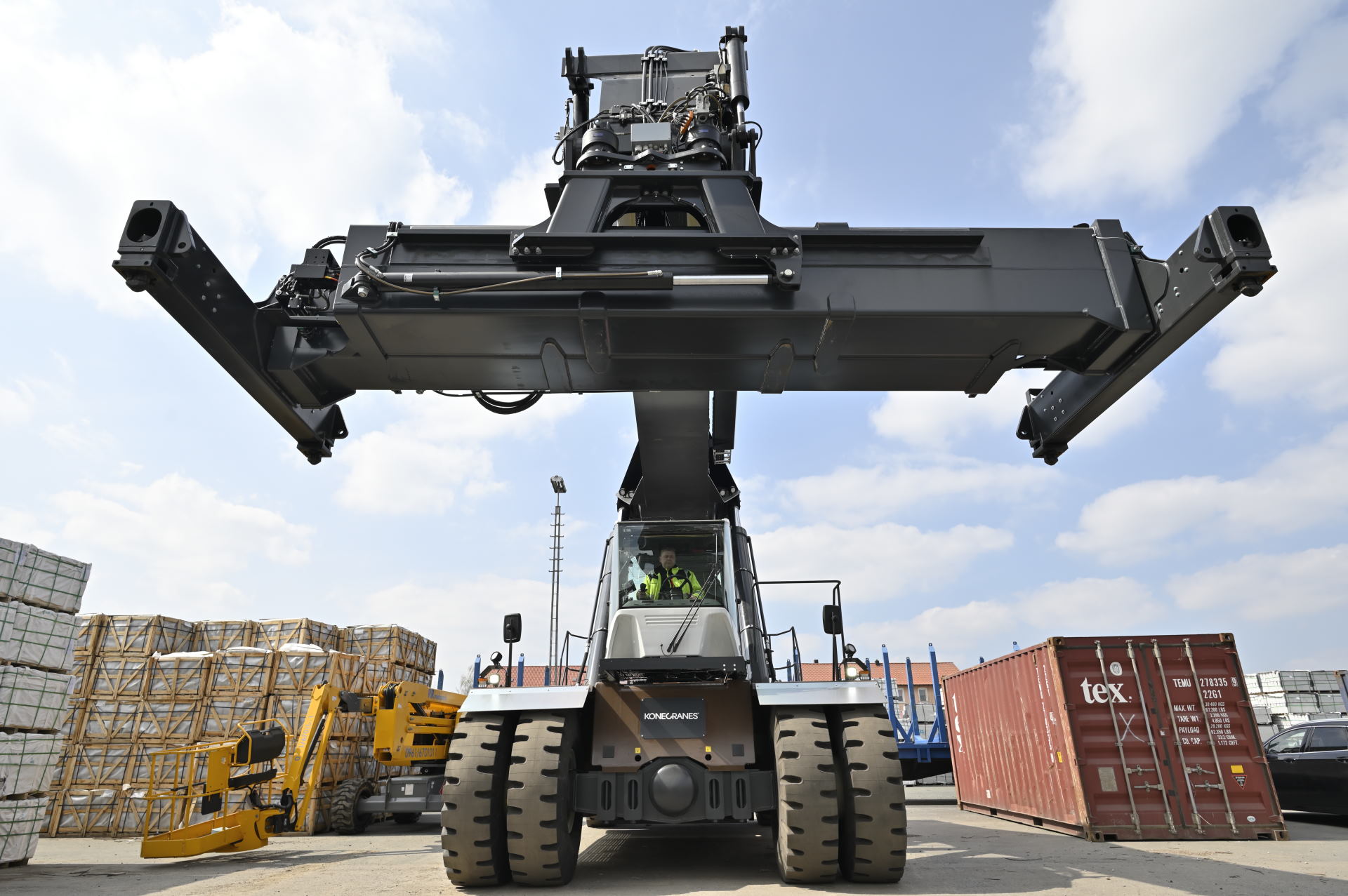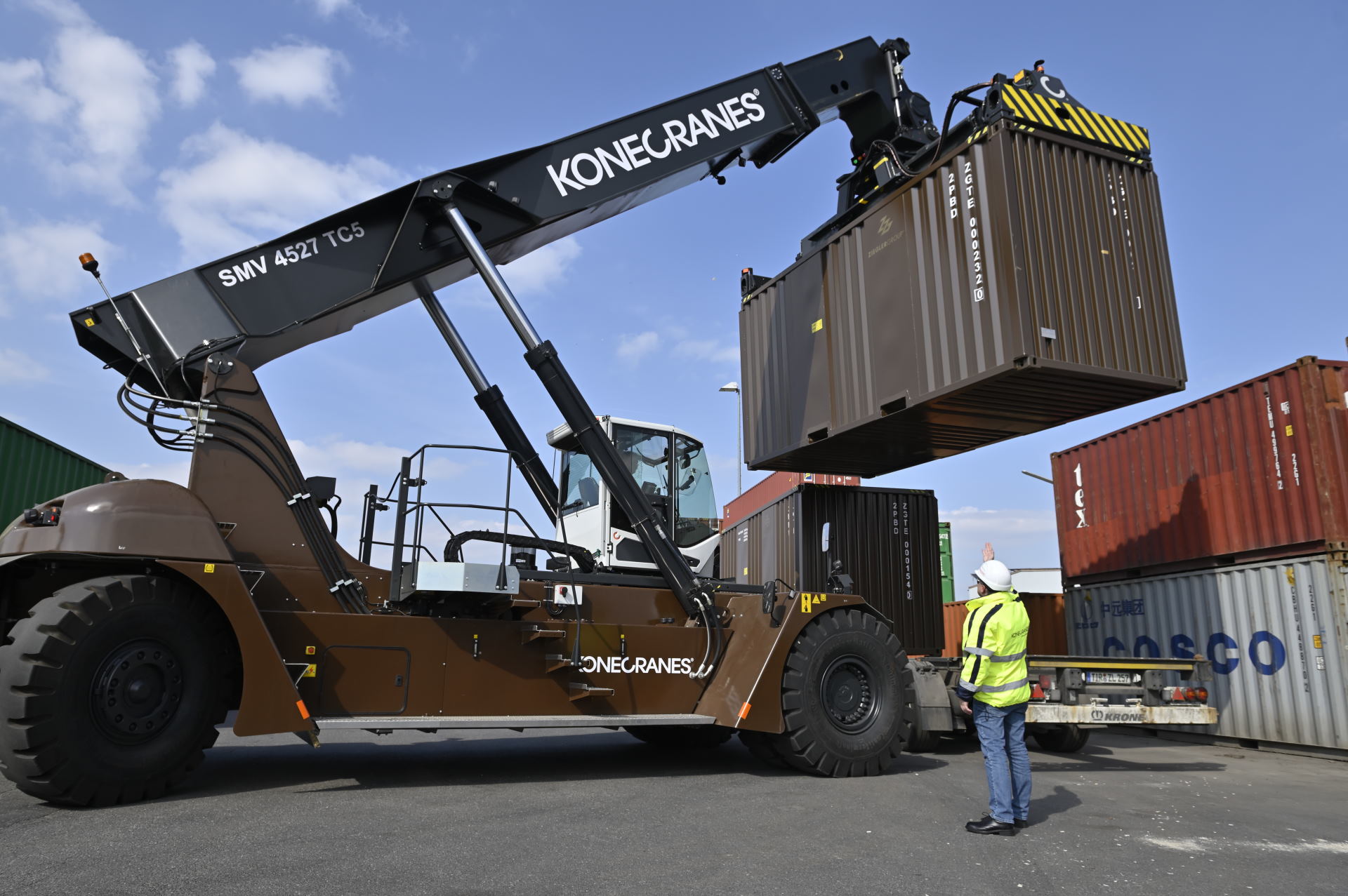 [Foto 1] Breit zupacken: Der neue Reach Stacker SMV 4527 TC 5 von Konecranes hebt für die Ziegler Gruppe im oberpfälzischen Wiesau bis zu 12 Meter breite und 45 Tonnen schwere Container – und bleibt dabei sehr leise.