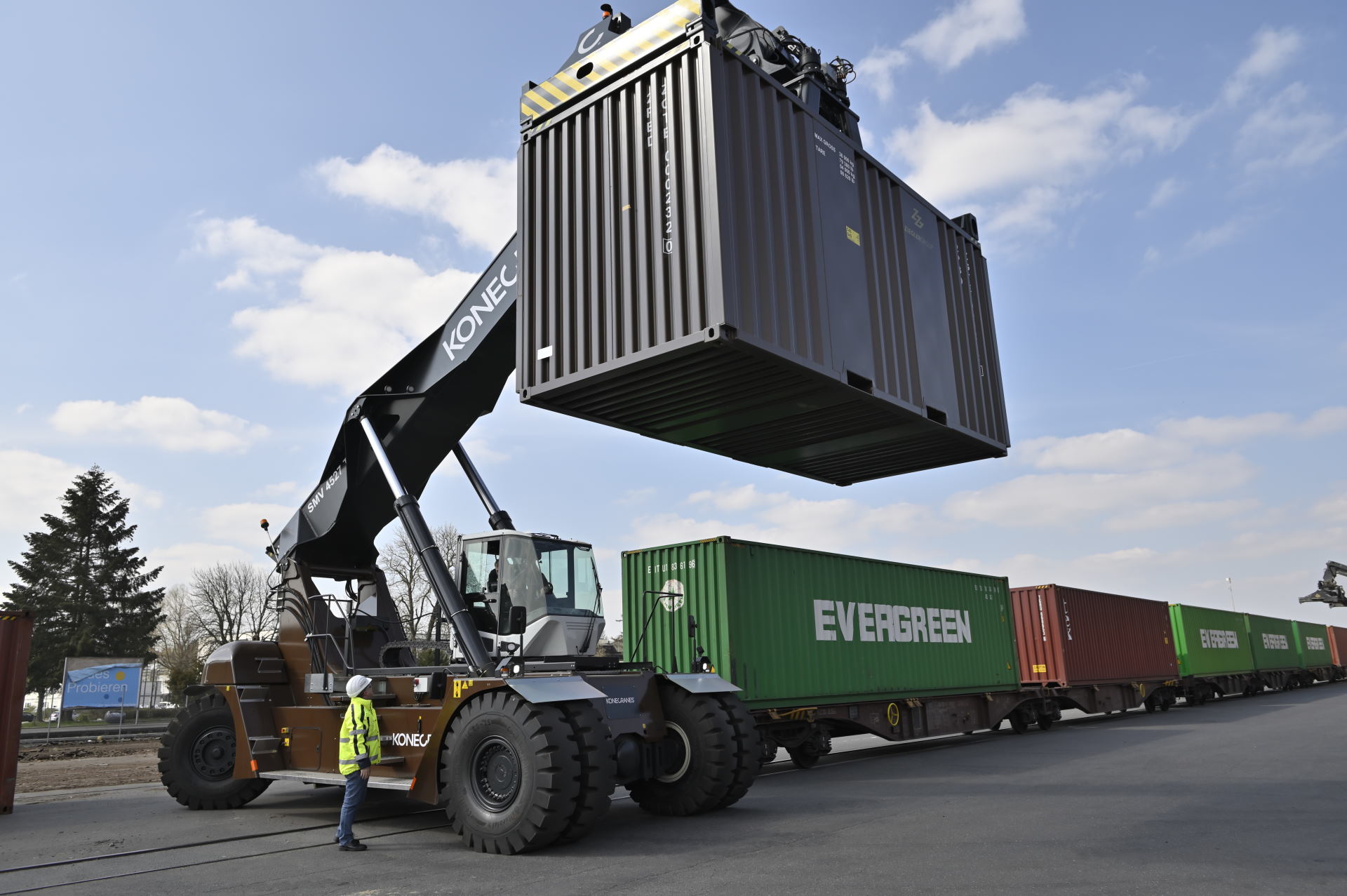 Container-Terminals sind die Schnitt- und Schlüsselstellen weltweiter Logistik. Denn die meisten Container müssen auf ihrer Reise mindestens einmal das Transportmittel wechseln – zum Beispiel vom Schiff auf den Lastwagen oder die Schiene. Die bis zu 40 Fuß (etwa 12,2 Meter) langen und tonnenschweren Metallcontainer müssen dabei feinfühlig, sicher und schnell transportiert werden – und wenn das Terminal in der Nähe eines Wohngebiets liegt, auch möglichst leise, denn Lärmschutz ist wichtig. Für den Warenumschlag am Lkw- und Schienen-Terminal Wiesau in Bayern benötigt die Ziegler Gruppe deshalb einen leistungsstarken Reach Stacker, der die schweren Container umsichtig, sanft und leise von Platz zu Platz hebt. Gefüllt sind diese beispielsweise mit Holzwaren, die der mehr als 70 Jahre alte Oberpfälzer Familienbetrieb in die ganze Welt verschickt. Für das „Tor zum Osten“ in Wiesau nahe der tschechischen Grenze hat Konecranes einen besonderen Reach Stacker konzipiert.
