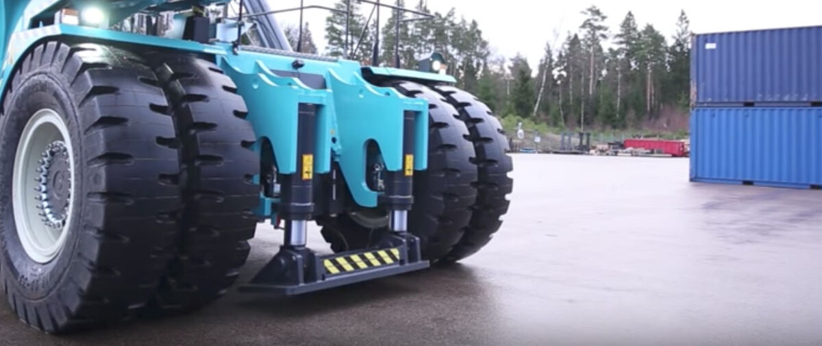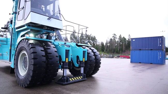Konecranes Barge handler, reach stacker, with support jacks for increased lifting capacity.
