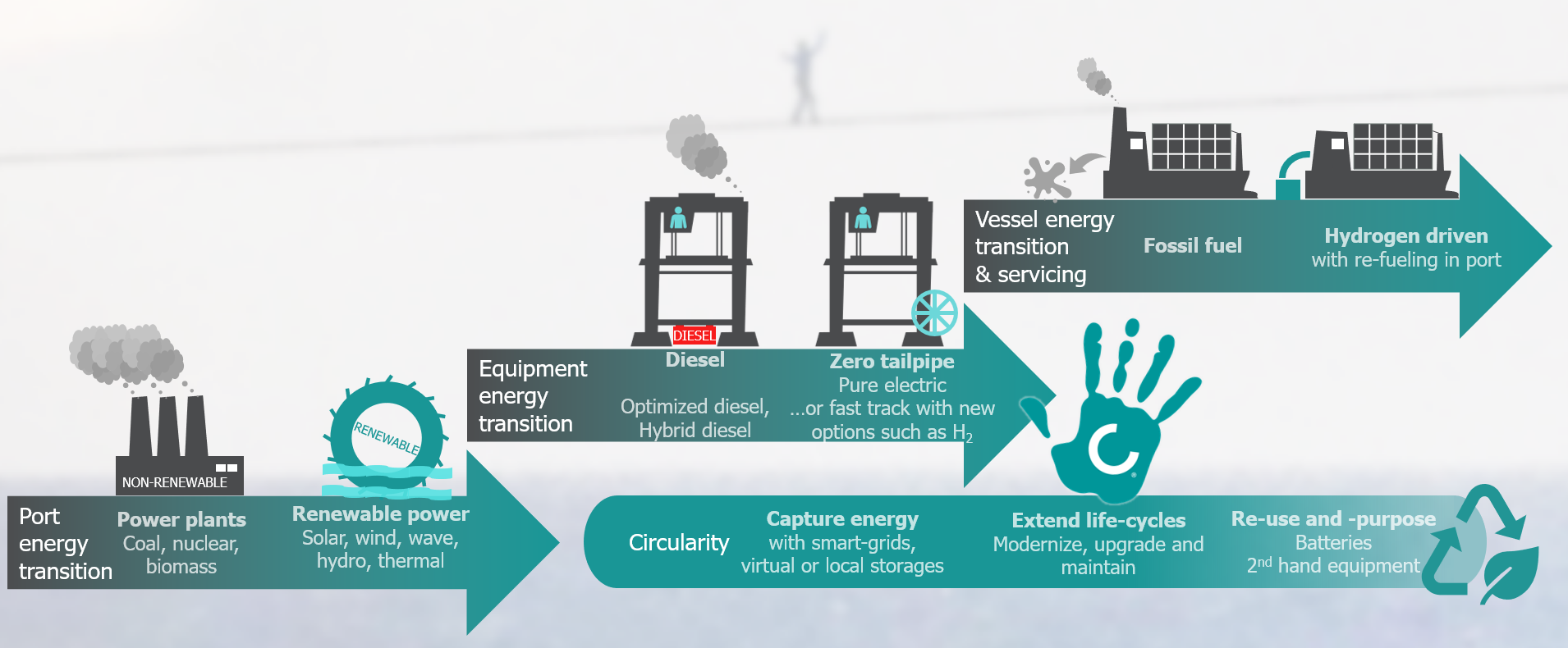 The relevance to using hydrogen as a fuel source – in combination with a combustion engine – is that Konecranes already has experience of successfully running hybrid-engine models (with electric power packs). Now it’s just a question of getting hydrogen engines up to speed so they can replace electricity.