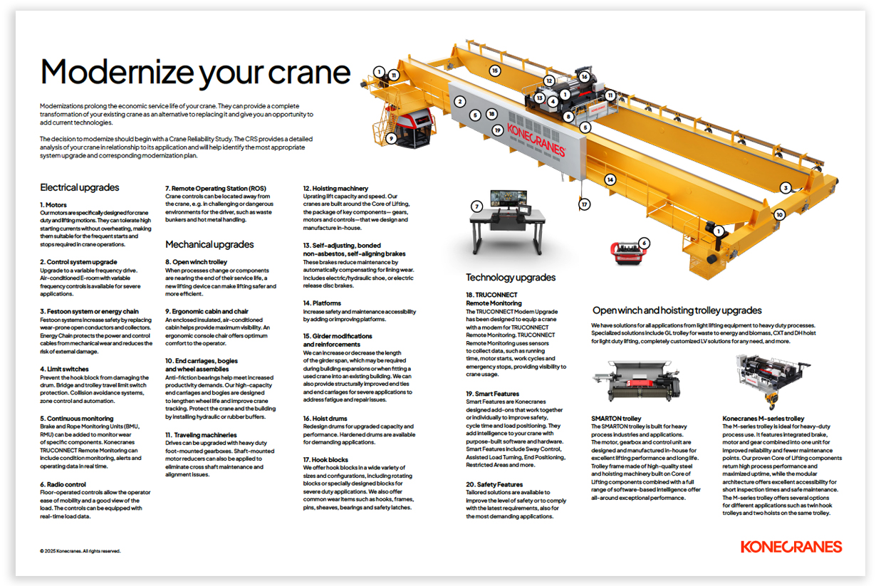 Modernizations are designed to prolong the economic service life of your overhead crane. They can provide a complete transformation of your existing crane as an alternative to replacing it and give you an opportunity to add current technologies.