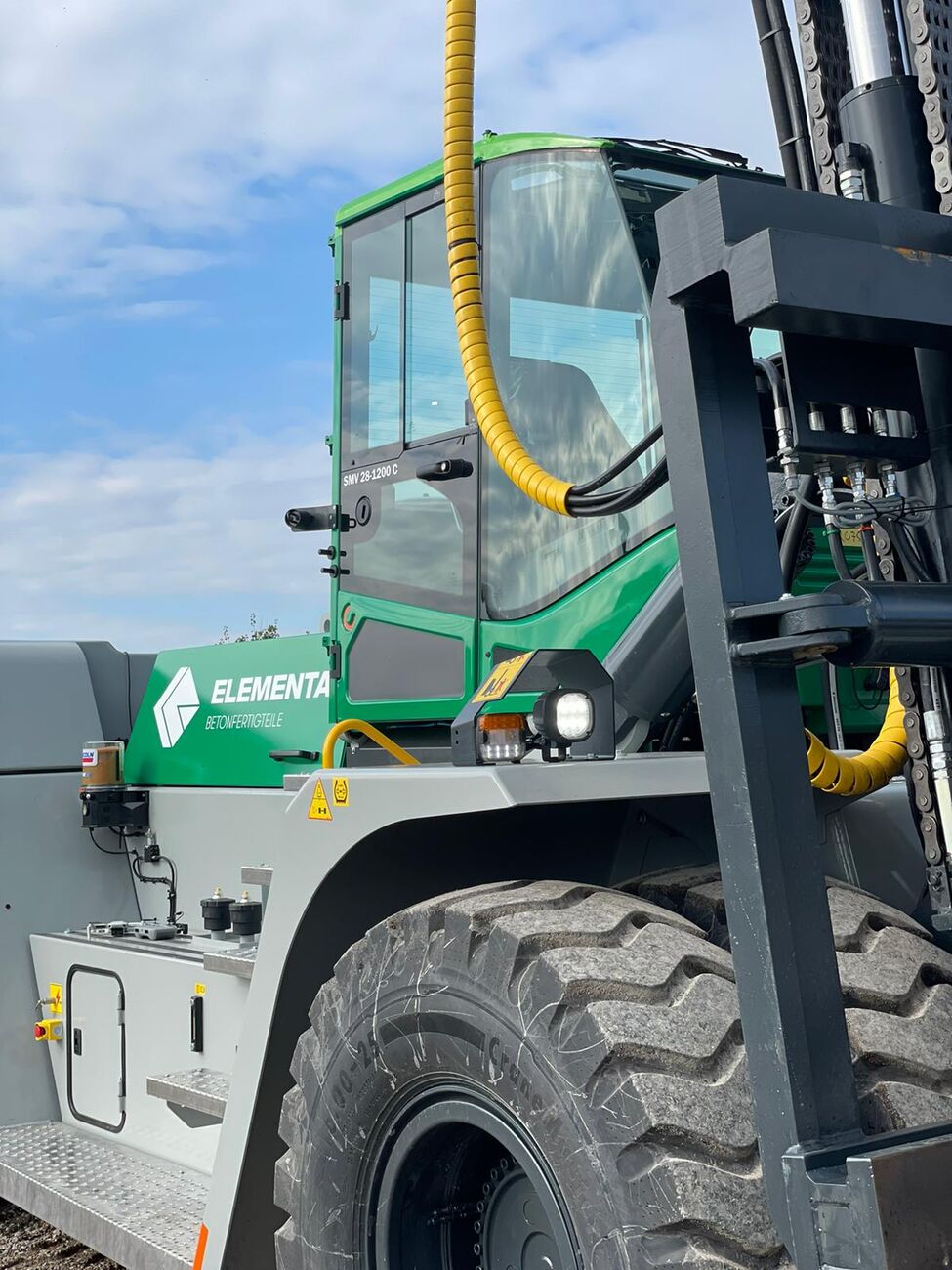 Their second Konecranes forklift, a 28-ton SMV 28-1200 C, was delivered in October 2021. A new-generation version of the earlier model with a slightly higher capacity, it features a sturdy wheelbase of 4,500 mm for the heavy lifting required to move the precast concrete. Its overall stability also helps the Elementa drivers protect the building elements from accidents as they load it onto the forklift and take it to storage or trucks that will move it off-site. The new lift truck has been fitted with a spacious, ergonomic cabin with easy-to-use controls and driver comfort, and wide windows with no front corner posts for excellent lines of sight in all directions.