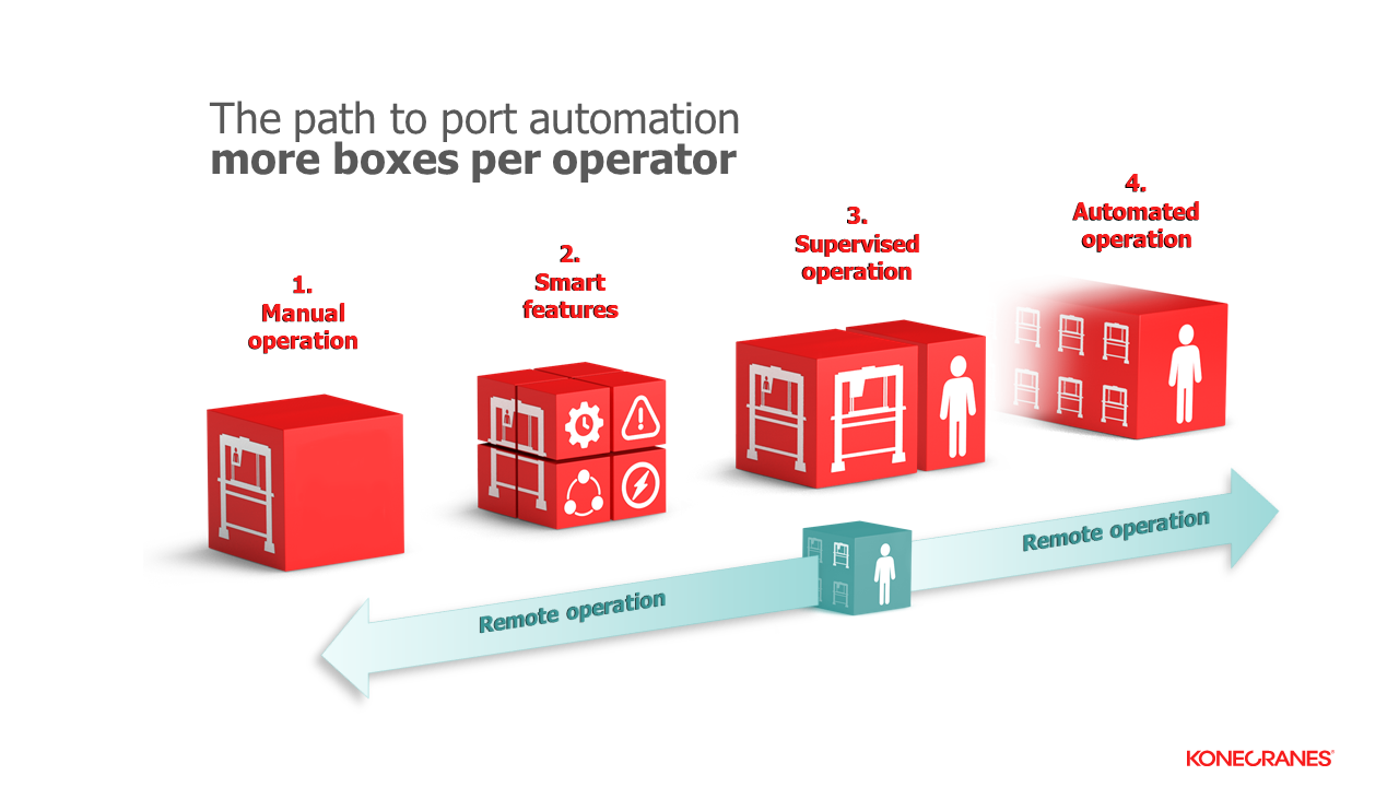 Our customers now have a path that can improve productivity and safety via automation in manageable steps - from day one. From smart features up to full automation, the path can include supervised operation and remote operation to smoothly introduce the power of automation. The path to port automation applies to all container handling equipment brands.