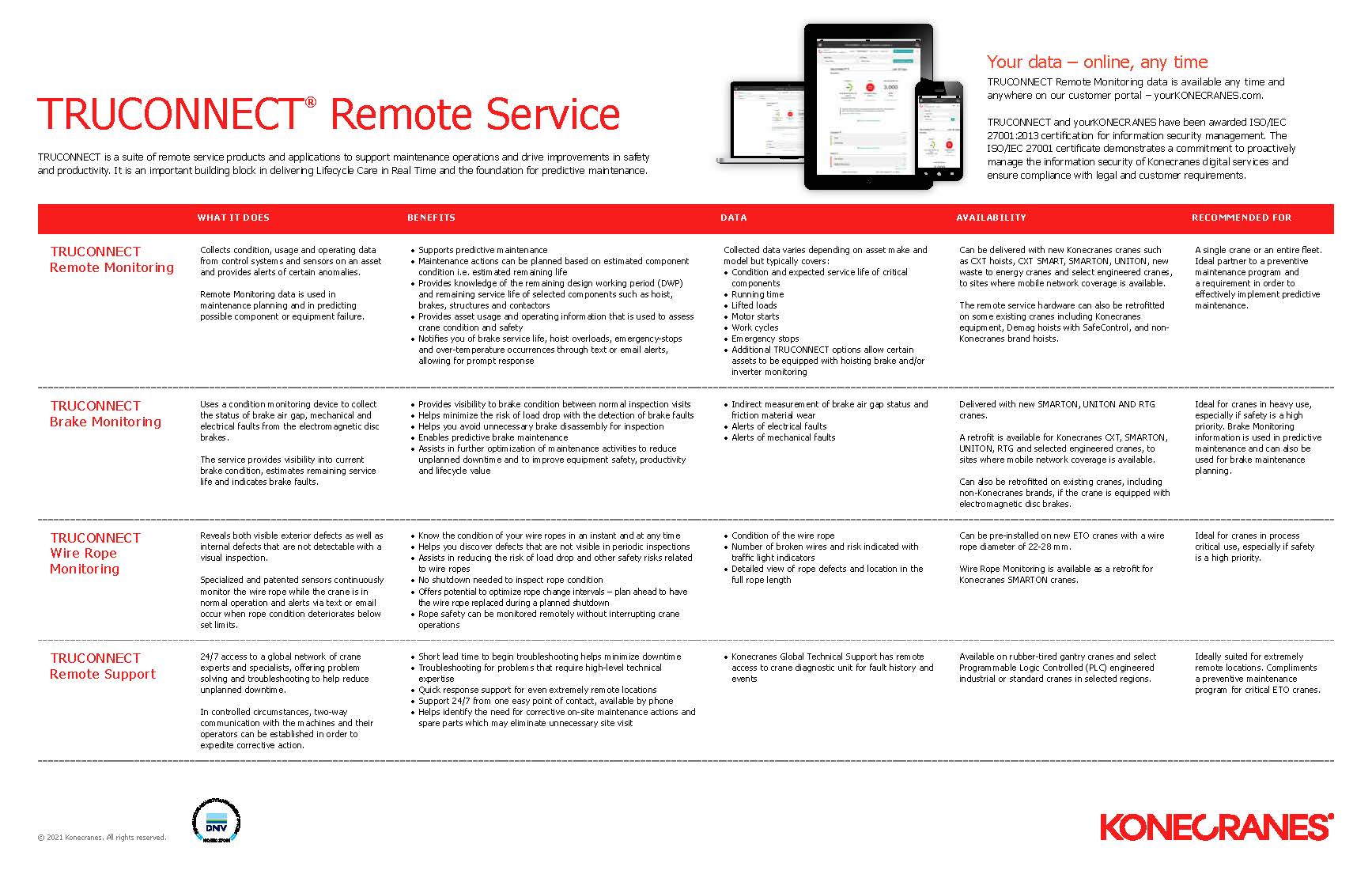 • TRUCONNECT is a suite of remote service products and applications to support maintenance operations and drive improvements in safety and productivity. TRUCONNECT provides the visibility you need to fully understand the day-to-day use of your cranes. Looking at the data on yourKONECRANES.com on a regular basis can help you make decisions on maintenance, safety concerns, training, productivity, and service and equipment investments.