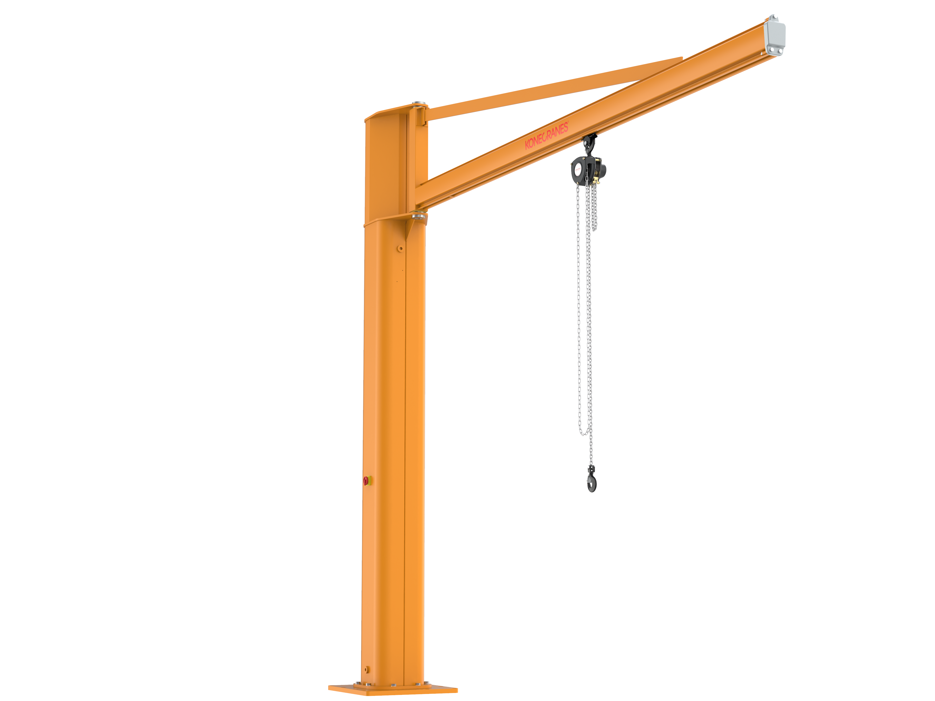 Konecranes jib cranes are suitable for almost any kind of workstation, from small workshops to big factory assembly lines, storage areas and loading bays. Jib cranes has a load capacity of up to 2,000 kg and a slewing motion that can reach 300 degrees with a pillar jib.