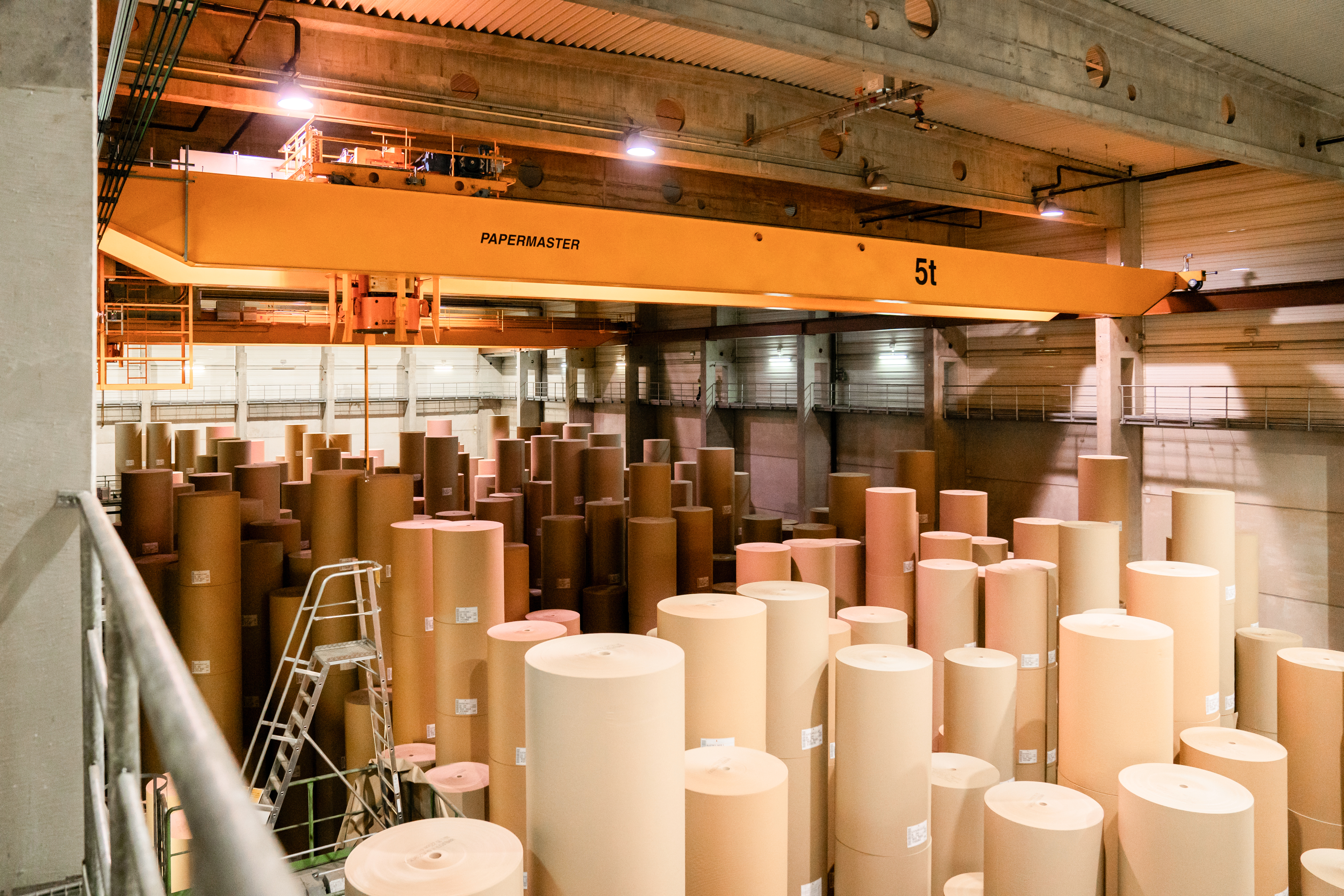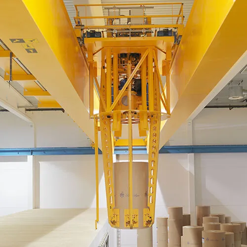 A mechanical gripper crane lifts paper rolls at a paper mill, takes them to storage, where they are usually kept vertically in stacks, and puts them into place for shipping. Handling paper rolls is a critical task in paper production, so they require smooth and efficient travel. A gripper crane is particularly useful when preparing for sea transport, as packing to prevent damage from the movement of a cargo vessel means that paper rolls cannot be lifted by vacuum technology.