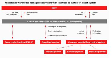 Warehouse employees do not operate automated paper cranes directly. The operator gives instructions to the Millwide Execution System (MES/ERP), which commands the Konecranes WMS, and the WMS controls the crane. The WMS is integrated seamlessly with a standard interface.