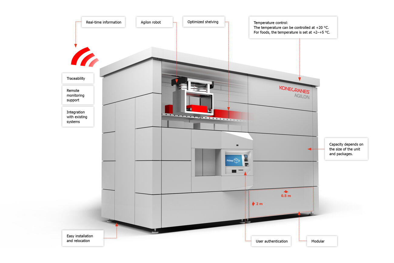 Konecranes on laajentanut palkitun Agilon-materiaalinhallintajärjestelmänsä käyttöä kylmätilallisiin kerätyn ruoan noutopisteautomaatteihin. Uudessa innovatiivisessa Agilon Grocery Pickup -ratkaisussa yhdistyvät huoneenlämpöinen ja jääkaappilämpötilainen osio. Ruokaostoksia ja paketteja säilytetään lämpötilakontrolloiduissa osastoissa noutoon asti. Pakasteet on pakattu kylmälaatikoihin. Automaatin sisällä toimiva robotti tuo noudettavat ruokaostokset ja muut paketit esteettömyysvaatimukset täyttävälle noutopisteelle.