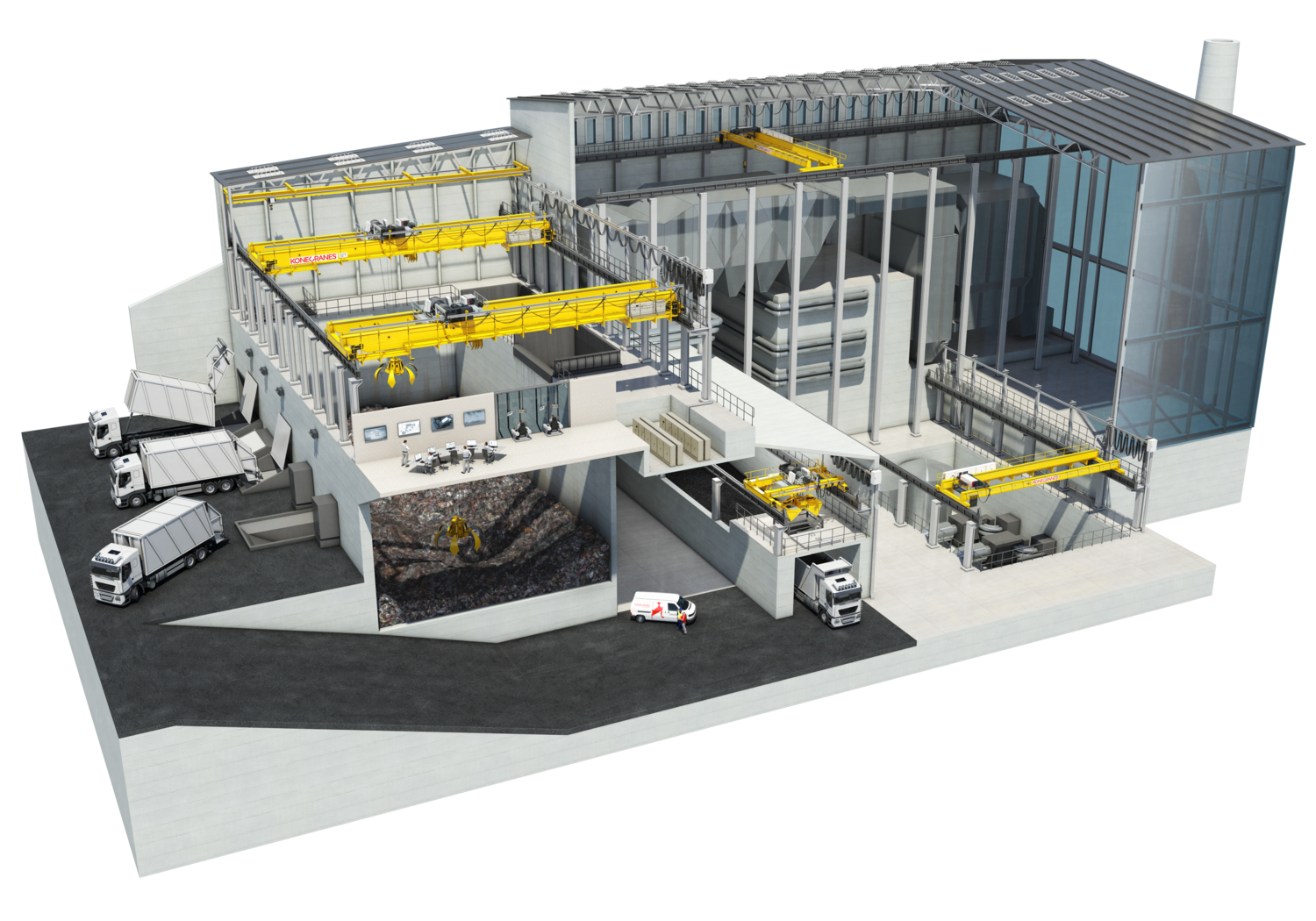 Les grues jouent un rôle crucial dans les usines d'incinération modernes qui appliquent des directives sévères sur le plan de la gestion environnementale. Il est important que les systèmes de manutention de matériel soient rentables et opérationnels en continu, de l'arrivée des déchets à la séparation et à l'incinération.