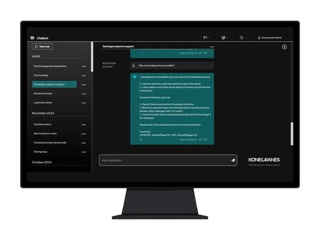 The chatbot is pre-trained on Konecranes servers using customer-specific documents such as equipment manuals, electrical drawings and service history, and is then securely transferred to the customer’s offline systems. As a result, operators have immediate access to relevant service documentation, historical maintenance data and step-by-step instructions for resolving common issues, which helps to reduce downtime and support safer, more efficient operations. With a scalable architecture and customizable knowledge base, the chatbot can adapt to specific customer workflows and industry needs, and supports multilingual use for diverse operational teams.