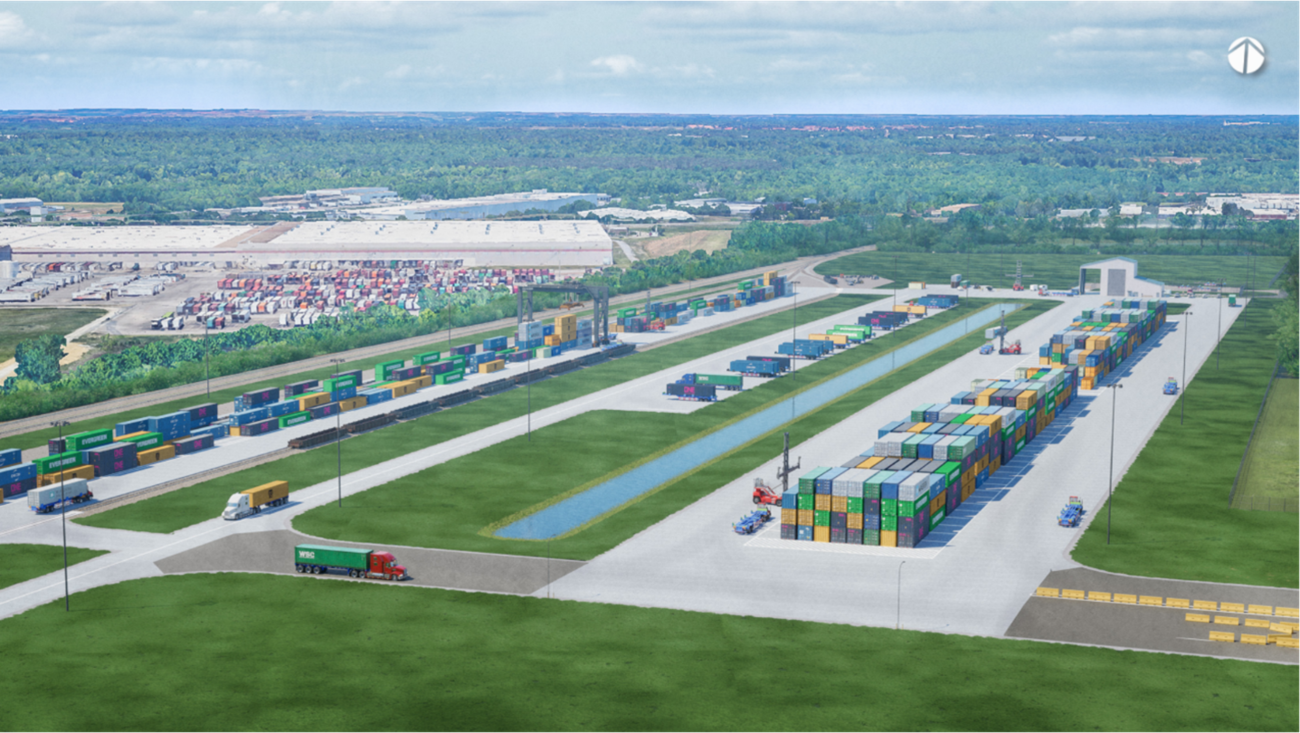 3D-mallinnus Montgomeryn intermodaalisesta konttikuljetuslaitoksesta, joka on tarkoitus avata vuoden 2027 alussa.