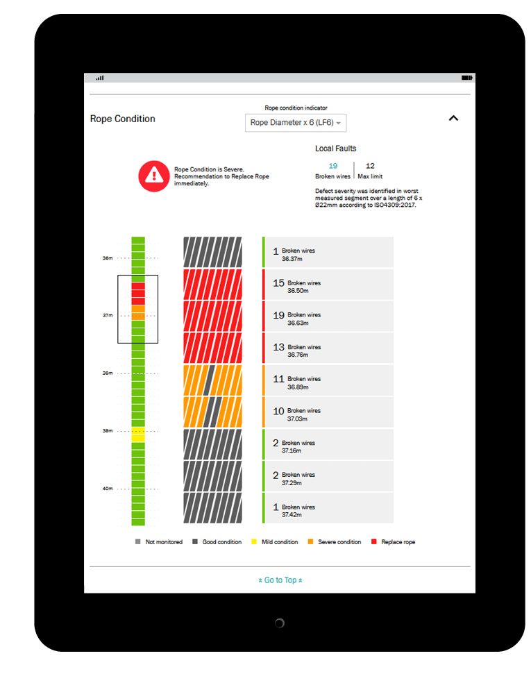 Real-time wire rope condition is presented in color-coded graphs to you quickly see if your rope is in good condition, needs attention or should be replaced immediately. An indication of defects on different parts of the rope helps you identify which parts of the wire rope have started to wear out and may need further attention.