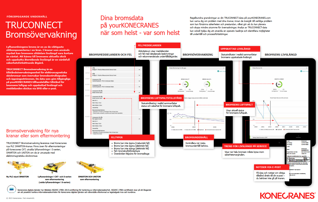 Lyftbromsen är en av de mest kritiska belastningsslitande komponenterna i en kran. I tungt använda kranar kan livslängden för bromsförslitningsdelar upphöra tidigare än förväntat. Den här infografiken visar vilken TRUCONNECT-bromsövervakningsdata på yourKONECRANES.com kan varna dig för problem med dina kranar innan de ger vika för kritiska problem som kan försämra säkerhet och prestanda.