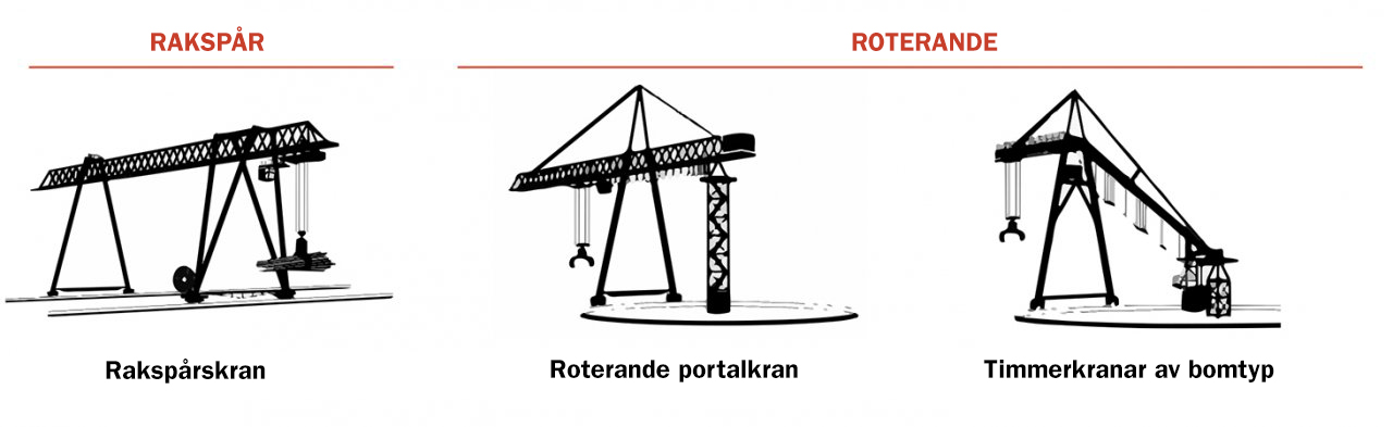 En roterande portalkran kan användas när rakspårskranar inte passar utrymmet. Lagring är tillgängligt både innanför och utanför skenan. Timmerkranar av bomtyp är perfekta när lastbilar måste lastas av snabbt. Dessa kranar är konstruerade för anläggningar med begränsat behov av lagringsutrymme.